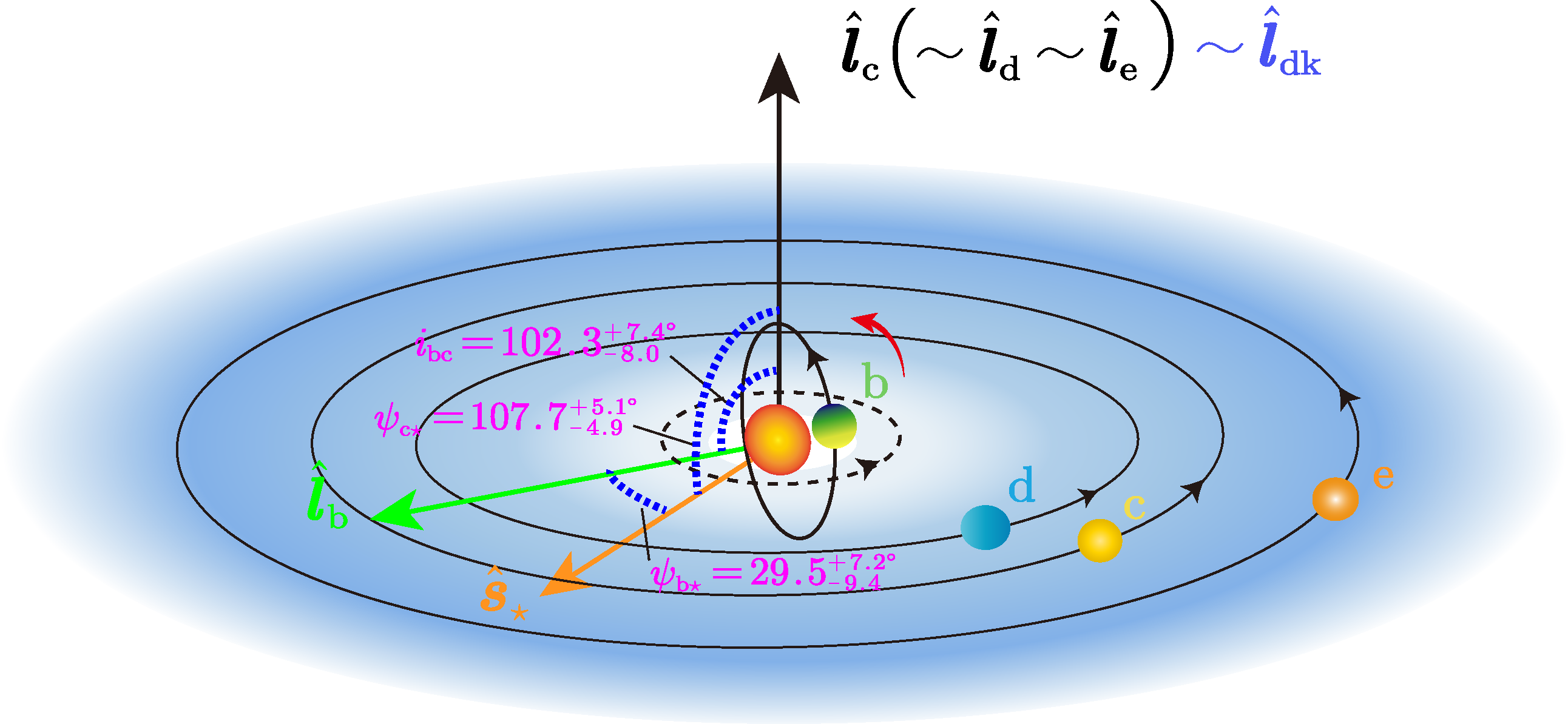 在已有观测中,HD 3167行星系统因其内部超短周期行星与外部三颗行星轨道的垂直和逆行特性而备受关注(如 图 1 所示)。现有理论难以对其形成过程给出解释。王悦副教授研究小组提出,这种独特的轨道结构源于行星系统早期行星盘和恒星扁率联合主导的动力学演化过程(如 图2 )。研究发现,随着光致蒸发引发的原行星盘耗散,在行星盘引力势与中心恒星扁率的共同作用下,系统在某一临界条件下将发生鞍点-中心的动力学分岔,该分岔将引起行星轨道平面经历急剧、非绝热的动力学状态转换,从而导致内外轨道产生大角度倾斜。随后,恒星的扁率衰减将导致行星轨道被拉普拉斯正交平衡点捕获,为逆行轨道的产生创造了条件。在整个过程中,广义相对论效应引起的近拱点进动是避免行星轨道混沌激发、保持偏心率稳定的关键因素。