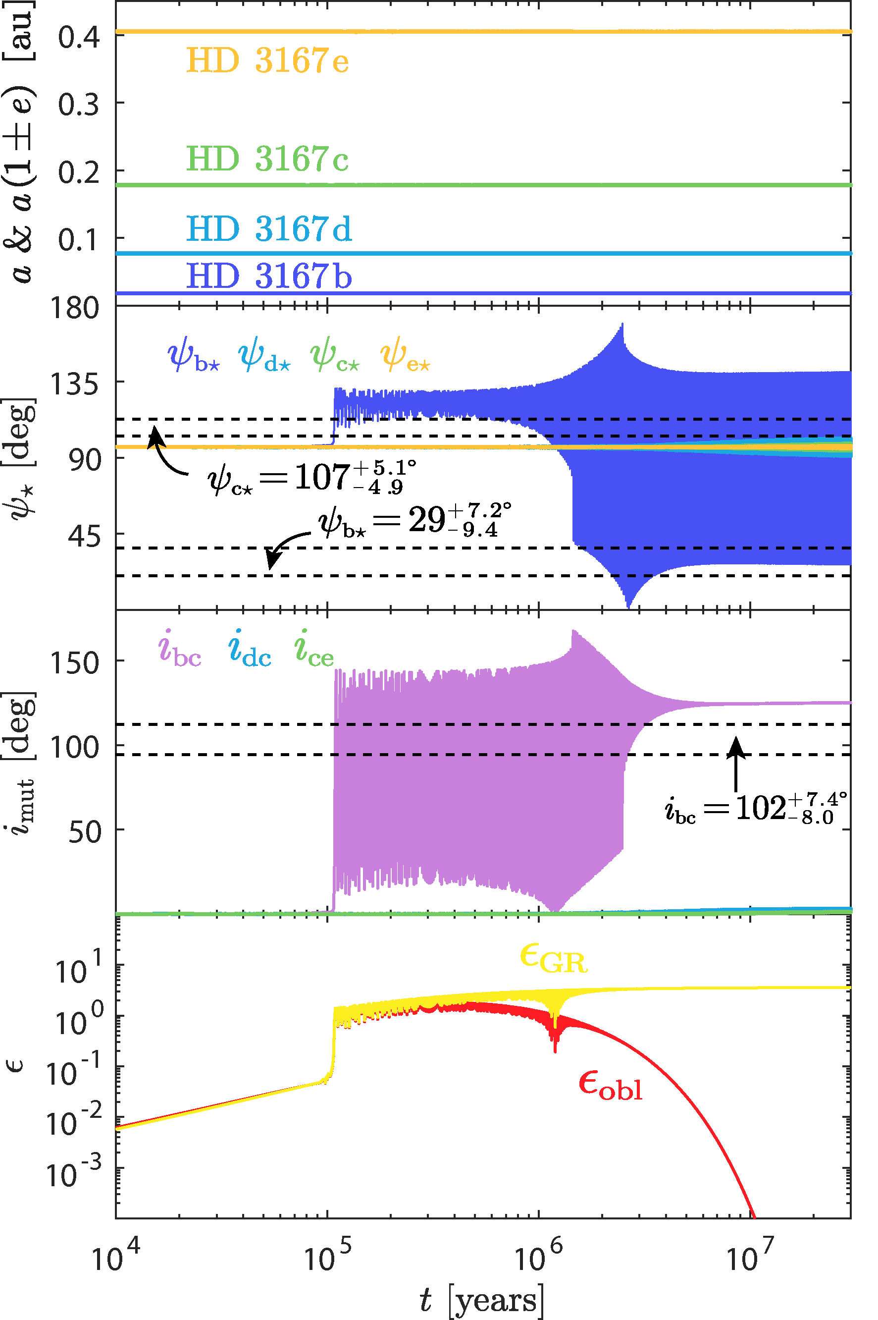 图 2 . HD 3167行星系统轨道动力学演化历史