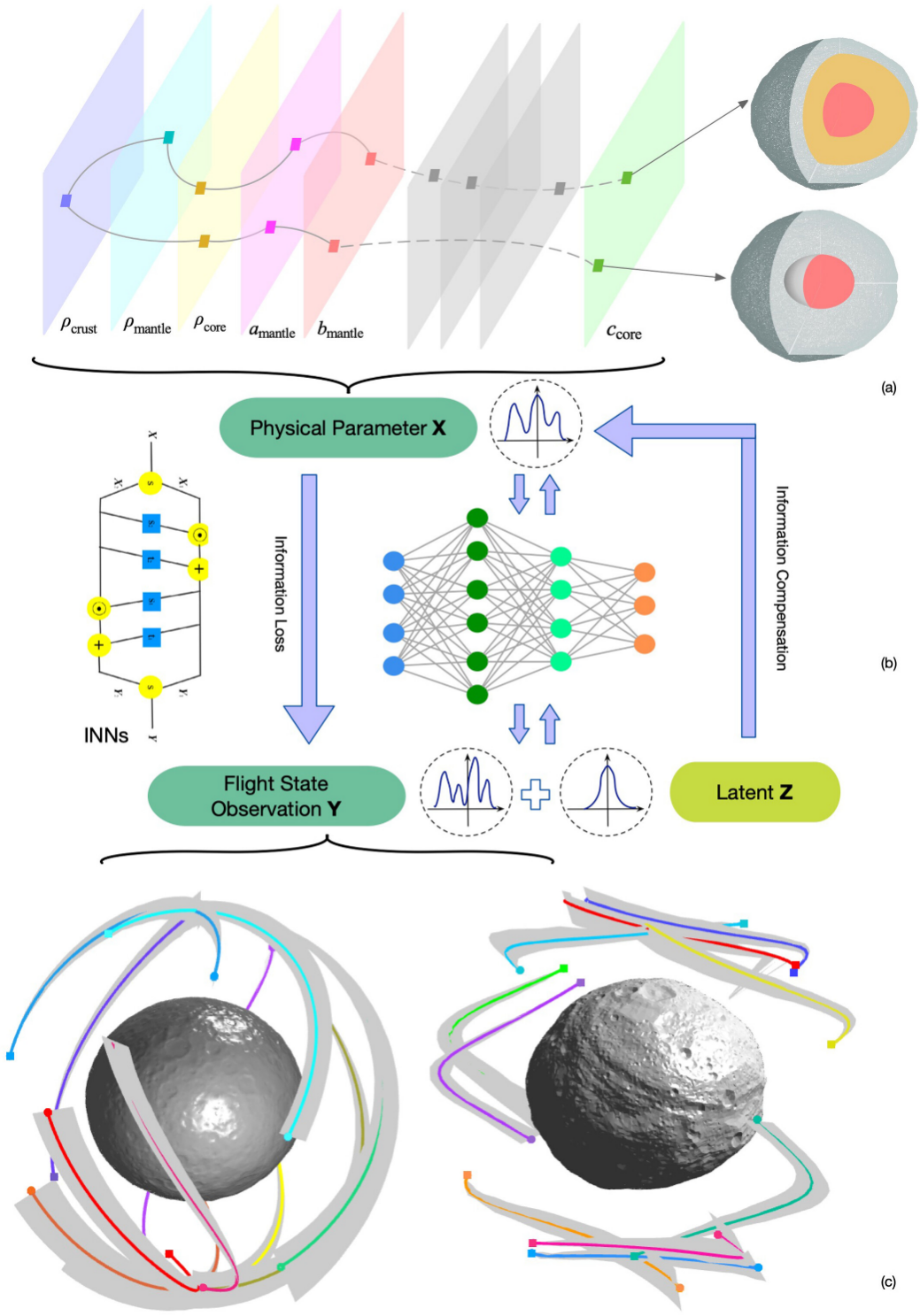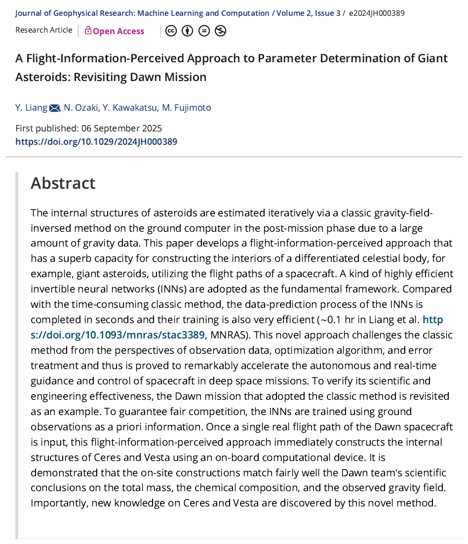 2025年10月,AGU旗下地学领域顶尖SCI期刊Journal of Geophysical Research系列的《地球物理学研究杂志:机器学习与计算》(Journal of Geophysical Research: Machine Learning and Computation,JGR: MLC)刊载了b体育必一运动研究团队在小行星内部结构构建领域的最新研究成果:“A Flight-Information-Perceived Approach to Parameter Determination of Giant Asteroids: Revisiting Dawn Mission”(基于飞行信息感知的巨型小行星参数确定方法:重温黎明号任务)。该成果面向深空任务中小行星内部结构难以实时获取的技术瓶颈,提出以一种训练效率极高的可逆神经网络(INN)作为基础框架,利用飞行轨迹直接反演天体内部参数的全新思路。此研究从观测数据、优化算法和误差处理等方面对传统方法提出了挑战,以采用经典方法的“黎明号”任务为例进行了回顾,并被证明能够显著加速深空任务中航天器的自主实时制导与控制。
