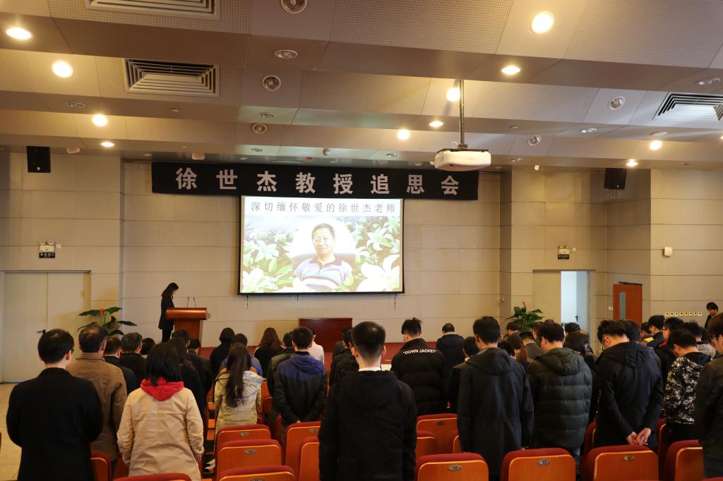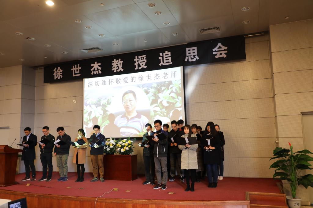 追思会开始,陈珅艳老师带领大家重温了徐世杰教授的生平事迹,全体到会人员面向徐老师遗像默哀一分钟,两名学生献花,全体行三鞠躬礼,寄托哀思,徐老师音容宛在,观者动容。