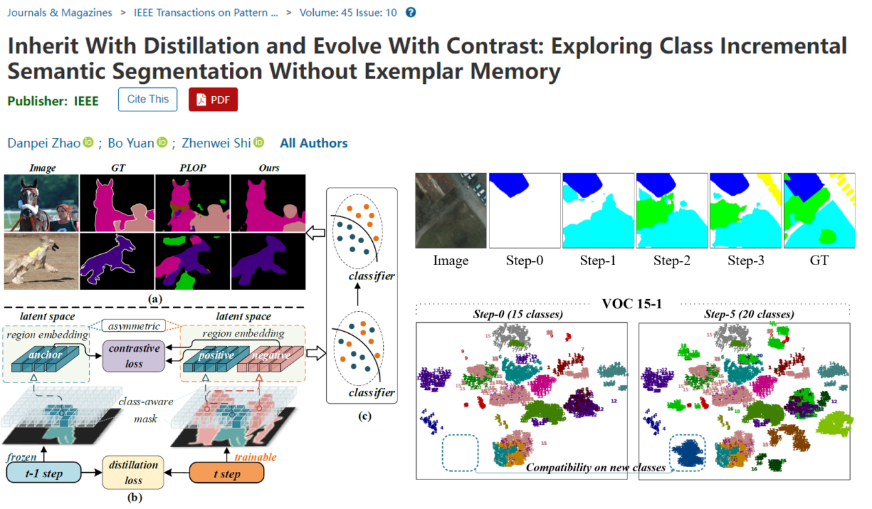 针对持续学习技术中对旧数据依赖程度高的问题,赵丹培老师团队提出无数据回放条件下的持续语义分割方法。通过研究持续学习中的灾难性遗忘和语义漂移问题的内在数学机理,针对类别增量持续语义分割任务提出了一种基于多层级知识蒸馏和非对称区域对比学习的模型增量更新方法,克服灾难性遗忘难点,能够在无数据回放的条件下实现模型的自主更新。所提出的模型在通用数据集和遥感数据集上均取得了领先的性能表现。(论文链接:https://ieeexplore.ieee.org/abstract/document/10120962)