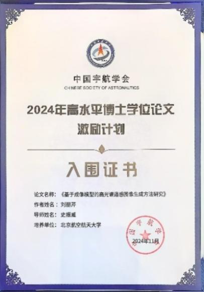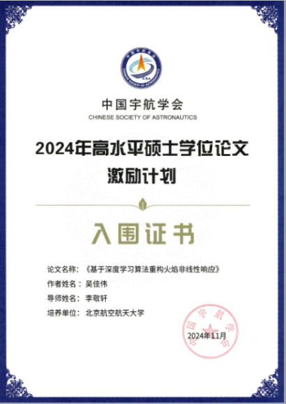 中国宇航学会高水平硕士学位论文激励计划入围证书