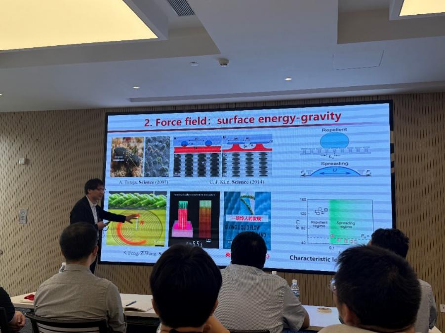 然后,王钻开教授作了题为“界面场匹配理论及能源应用”的学术报告,报告由b体育必一运动冀秉强教授主持。王教授系统回顾了其团队近年来的突破性成果:通过异质界面设计,打破固液接触时间物理极限(力),实现流体二极管效应(力),提升水能收集效率(电),突破莱顿弗罗斯特效应的限制(热);并从“场”的角度综合分析代表性异质设计,提出场匹配理论,阐明异质性如何赋能流固界面的能量转换。团队通过调控异质界面、重构流场与梯度场,使原本不匹配的物理场和流场相互匹配,实现能量最大化输出。王教授还提出了异质性系数,阐述界面性质、流体特性与宏观性能的关系,并建立了普适性更强的势能转换方程。交流环节,来自多个院系的师生与王教授就仿生结构设计、能量转化机制及理论普适性等议题进行了热烈讨论。王教授结合自身科研经历,勉励研究生开阔思路、保持好奇、深入钻研,努力产出具有重要影响力的科研成果。