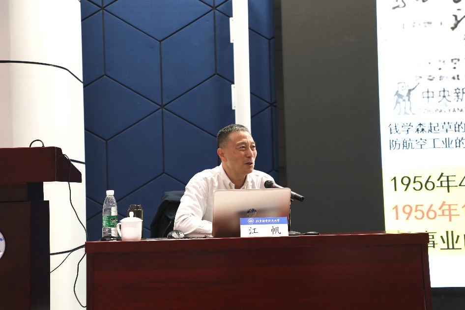 江帆研究员讲述了中国共产党领导下“航天(传统)精神”、“‘两弹一星’精神”、“载人航天精神”、“北斗精神”和“探月精神”五大航天精神的形成、发展和传承。江帆研究员从建国初期我国国防事业的发展讲起,讲述了钱学森、于敏等老一辈知识分子献身国防,为祖国实现从无到有重大突破的伟大事迹;并以几个重点导弹型号的研制历程为出发点,讲述了国防建设史上党的领导下全国人民对西方国家奋起直追的伟大突破;之后,江帆研究员解读了航天精神在新时代的传承与发展,并敦促同学们努力学习,为国家建设做出贡献。讲座中播放了关于航天史和国防史多个纪录片段,当鲜活的历史展现在观众面前,大家都被老一辈知识分子的情怀所感动,也充分认识到党的领导下国家七十多年发展历程的艰辛与伟大。