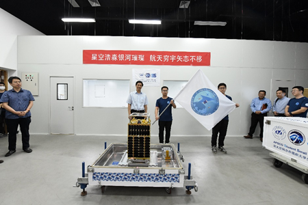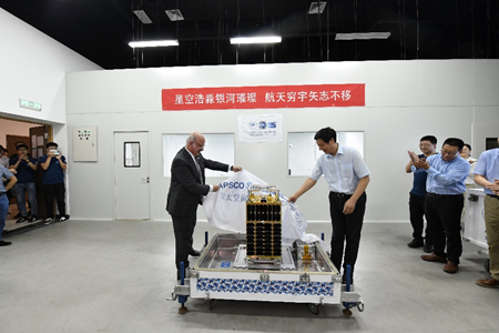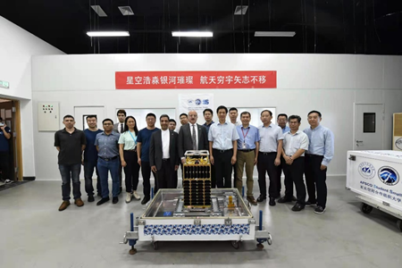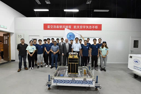 徐惠彬校长与亚太空间合作组织副秘书长Ferhat来到小卫星实验室,聆听了学生总师对APSCO-SSS研制过程的介绍,徐惠彬充分肯定了项目师生的努力成果。随后进行卫星入校揭幕式,校长徐惠彬院士向学生总师授旗,并与项目师生合影留念。