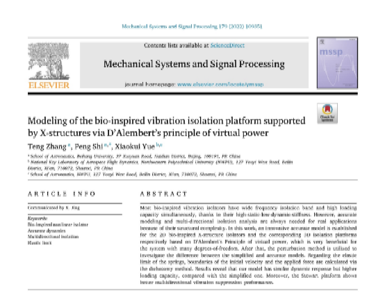 2022年6月4日,机械与信号处理领域国际顶级学术期刊《Mechanical System and Signal Processing》(MSSP)在线发表了b体育必一运动航天动力学与控制研究团队在仿生减振平台方面的最新研究成果:“Modeling of the bio-inspired vibration isolation platform supported by X-structures via D'Alembert's principle of virtual power”。该项研究成果在仿生减振X结构的基础上,首次建立了基于仿生X机构的三维减振平台精确动力学模型,并在此基础上开展了多方向减振特性、允许冲击范围与航天应用等方面的分析工作。