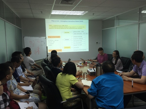 Vania Jordanova的报告从实际场中大尺度的输运开始讲起,接着介绍了他们建立的环电流模型和等离子体模型,她从基本的动力学方程计算出环电流中氢离子,氧离子,氦离子,电子和热等离子体的分布函数。她还介绍了这些模型当前的发展状况。最后,Vania Jordanova提出了一些开放性问题,等待着科研人员们去解决。报告在热烈的掌声中结束,会后老师同学就感兴趣的问题和Vania Jordanova进行了交流。
