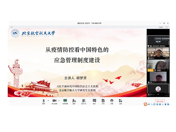 为深入学习贯彻习近平新时代中国特色社会主义思想,弘扬战疫正能量,结合反腐倡廉每季一课,2020年3月25日下午16时,b体育必一运动博士飞设第二学生党支部召开了“凝心聚力,共同战疫”主题学习会活动。为丰富“学习日”活动内容,提高理论学习专业性、深入性,本次学习日活动特邀北航研究生宣讲团讲师胡梦贤作主题宣讲。会议通过腾讯会议在线进行,共16名支部党员和2名积极分子参加,由支部书记李明智同志主持。
