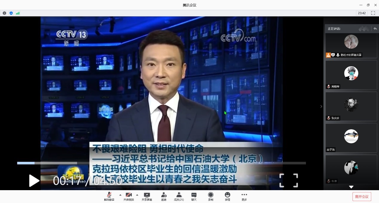 陈科研同学带领大家重点学习了总书记给中国石油大学(北京)克拉玛依校区的毕业生们的回信。