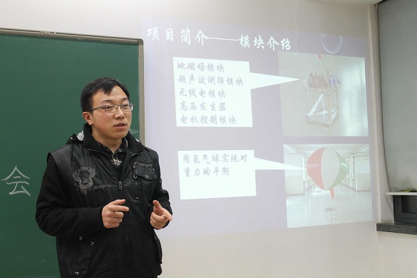 之后鱼伟东学长详细介绍了他获得“冯如杯”制作大赛机电类三等奖的项目——基于Biefeld Brown效应的卫星姿态控制演示模型。学长从原理、设计、控制模式等多方面分享了他的经验,并提供了一些查阅资料的方法和注意事项。