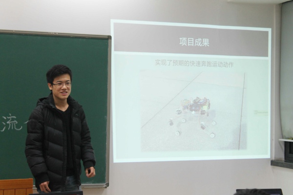 首先张睿学长展示制作大赛项目——猎豹四足奔跑机器人,荣获冯如杯制作大赛机械类二等奖。张睿学长从机电控制、机械设计和材料购买等多个方面介绍了制作的过程。同时也指出了设计的不足之处:包括应该在设计之初考虑重量、电压匹配等问题。